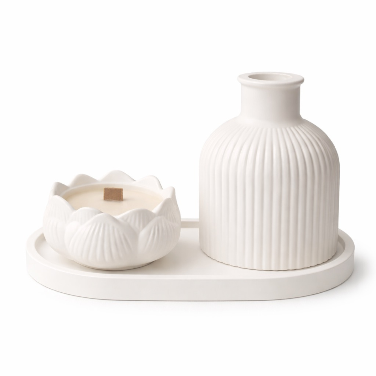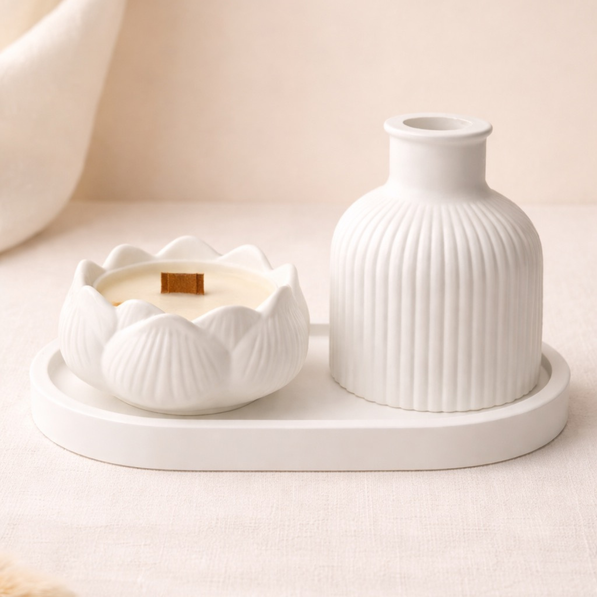 Balto atspalvio, rievėtas netaisyklingo cilindro formos žvakidė ir lotoso formos žvakė subtiliai dera tarpusavyje, o ovalus padėklas sujungia kompoziciją į vientisą, vizualiai švarią formą. Deganti žvakė suteikia minkštą, šiltą šviesą, kuri sukuria ramybės pojūtį.